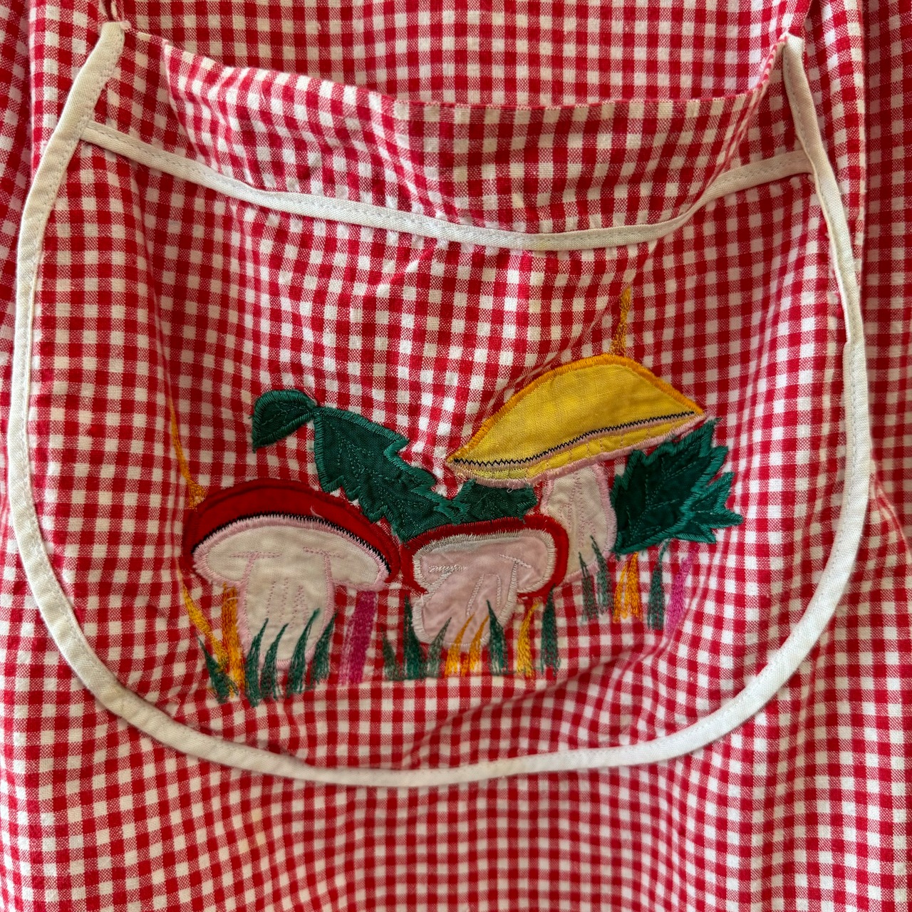 商品説明:キノコの刺繍とチェック柄のコンビネーションがとてもかわいい、レトロ感たっぷりのエプロンです。エプロンとしてはもちろん、洋服とレイヤードを楽しんでいただくこともできます。