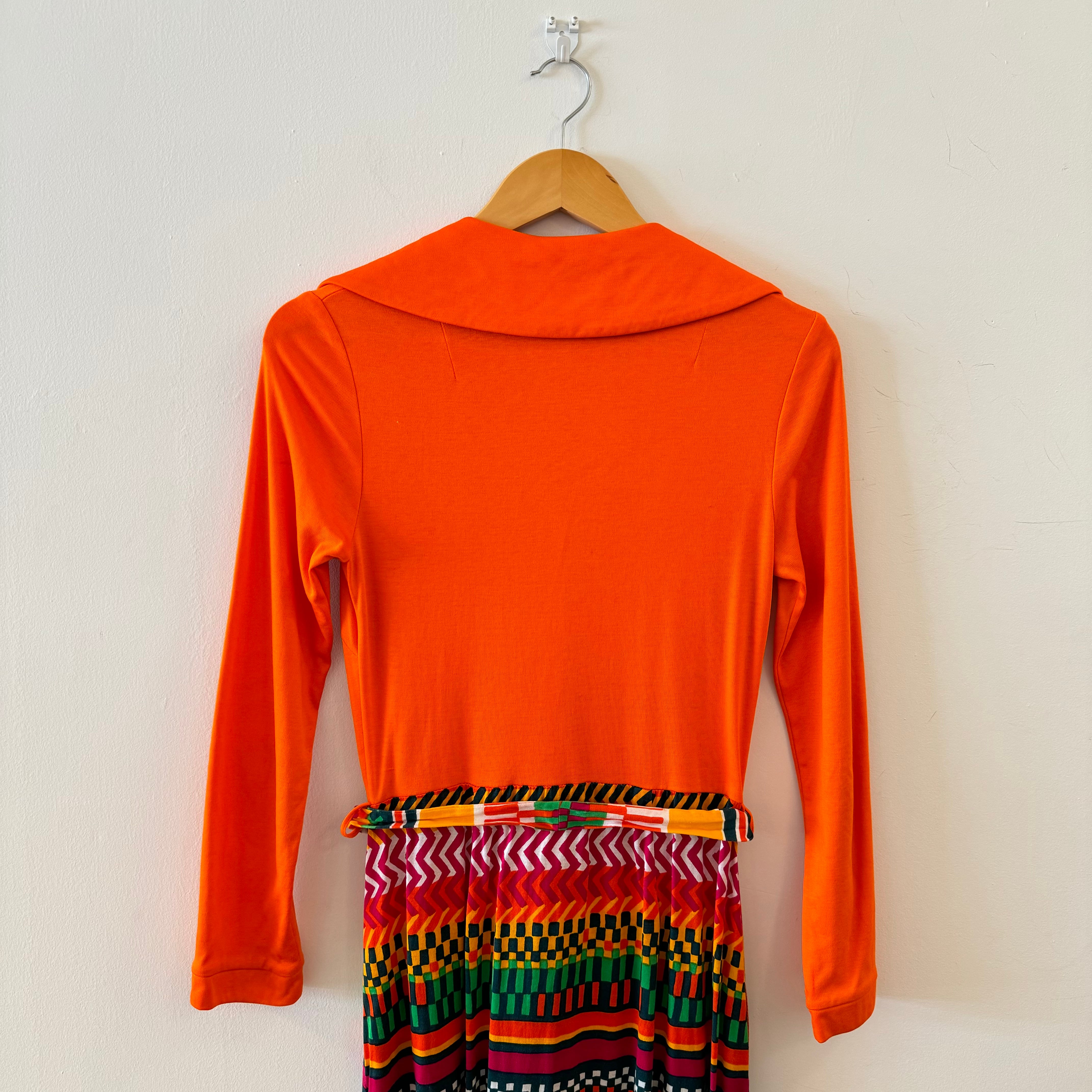 商品詳細 : 目を引くビビッドなオレンジのトップスと、カラフルな幾何学パターンのスカートがドッキングされたレトロなマキシワンピース。