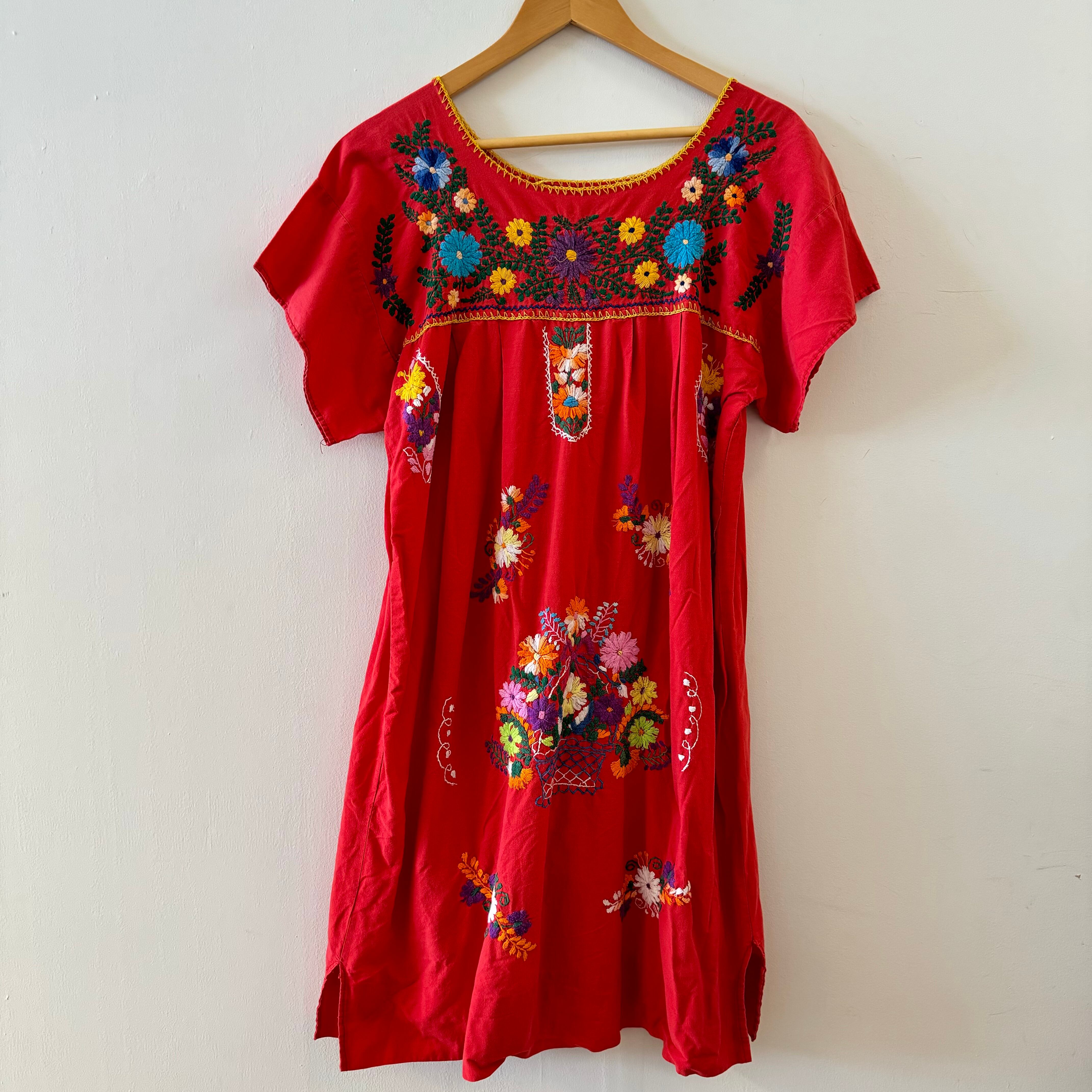 商品詳細 : 鮮やかなレッドをベースに、カラフルな花刺繍が施されたメキシカンテイストのワンピース。