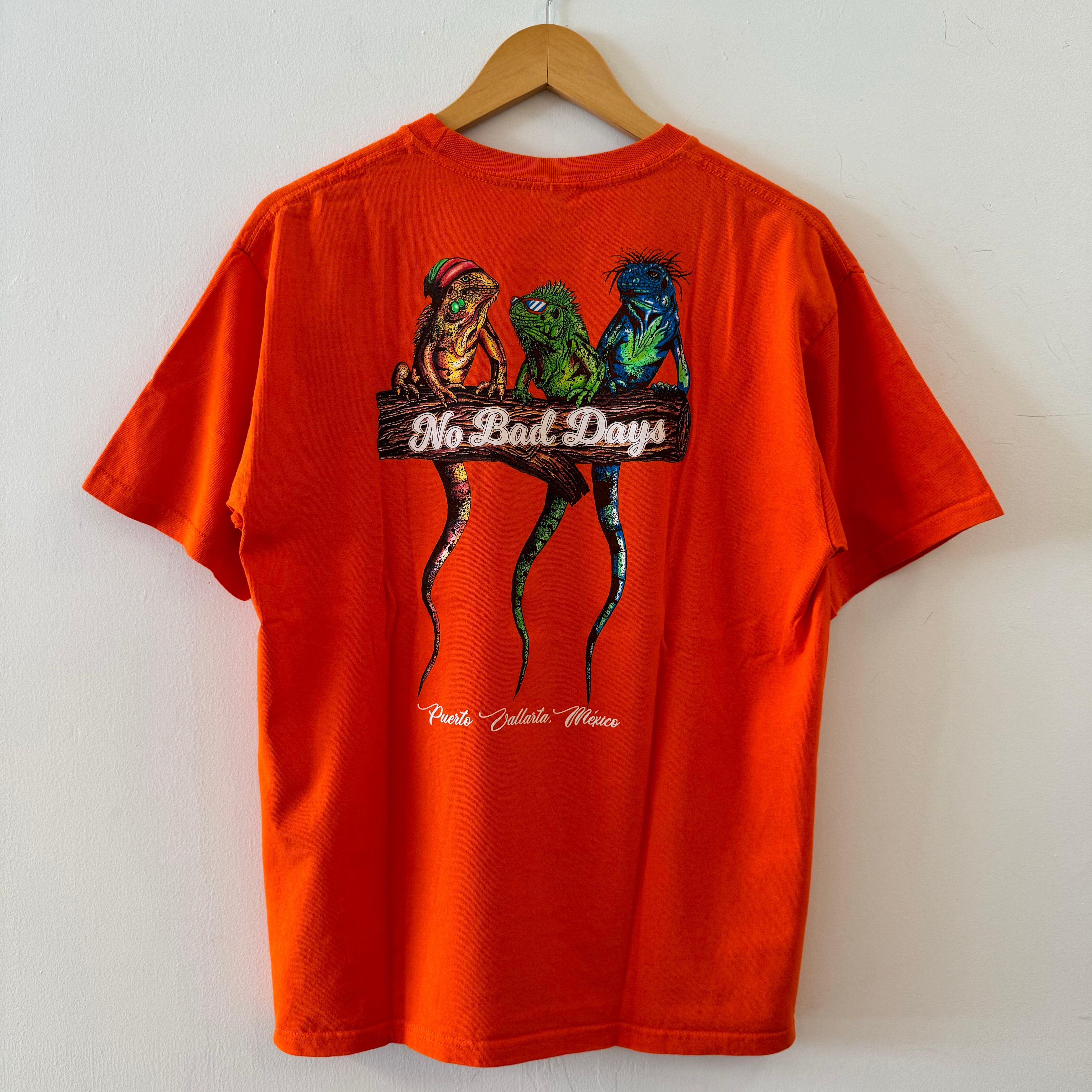 フロントとバックに、カラフルなイグアナと「No Bad Days」のメッセージがデザインされています。