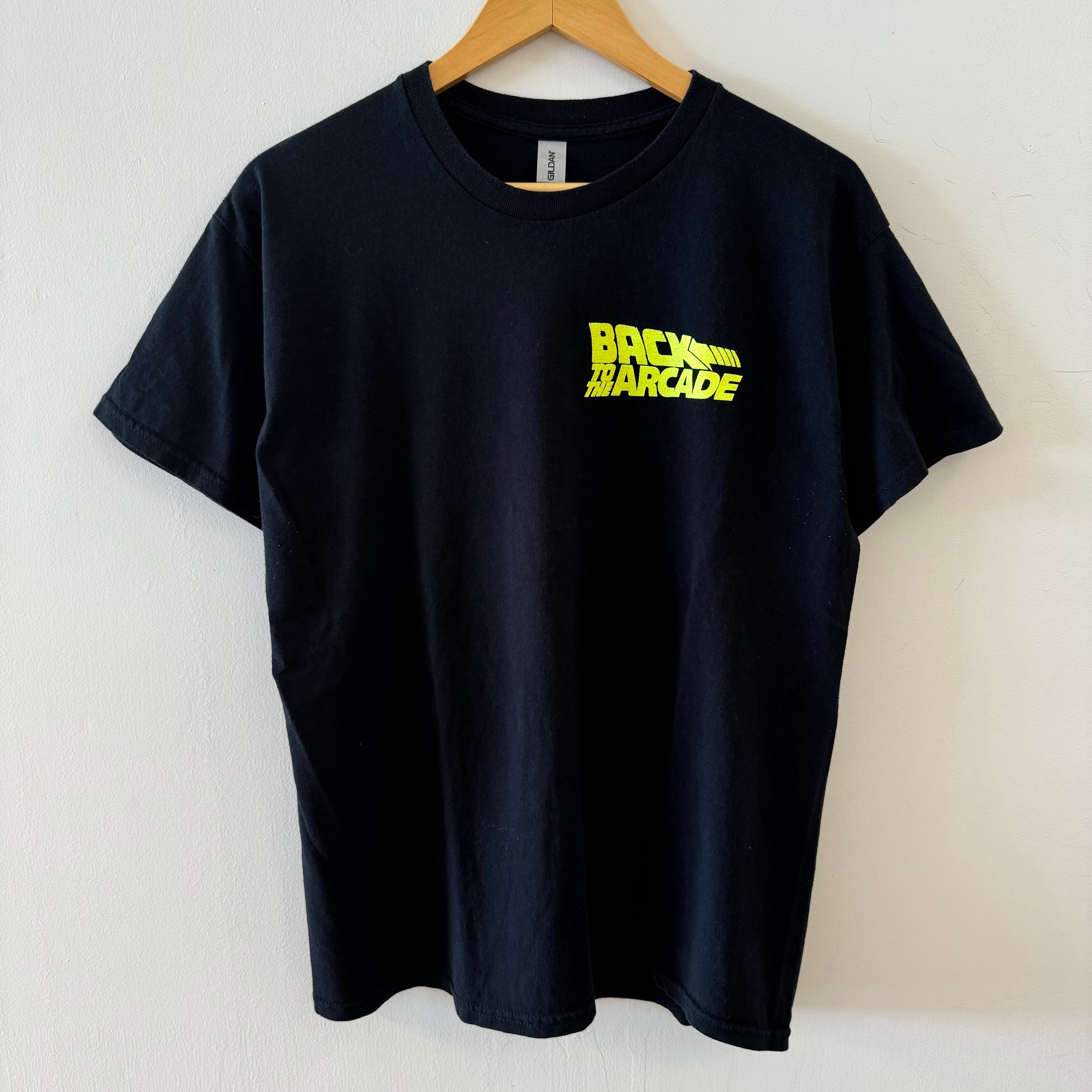 商品詳細 : このTシャツは「BACK TO THE ARCADE」と書かれたアーケードゲーム関連のデザインTシャツです。