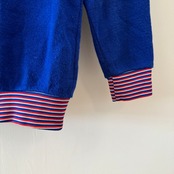 襟元と袖口、裾に施された赤×白×ブルーのボーダーリブが、スポーティかつ可愛らしいアクセントになっています。