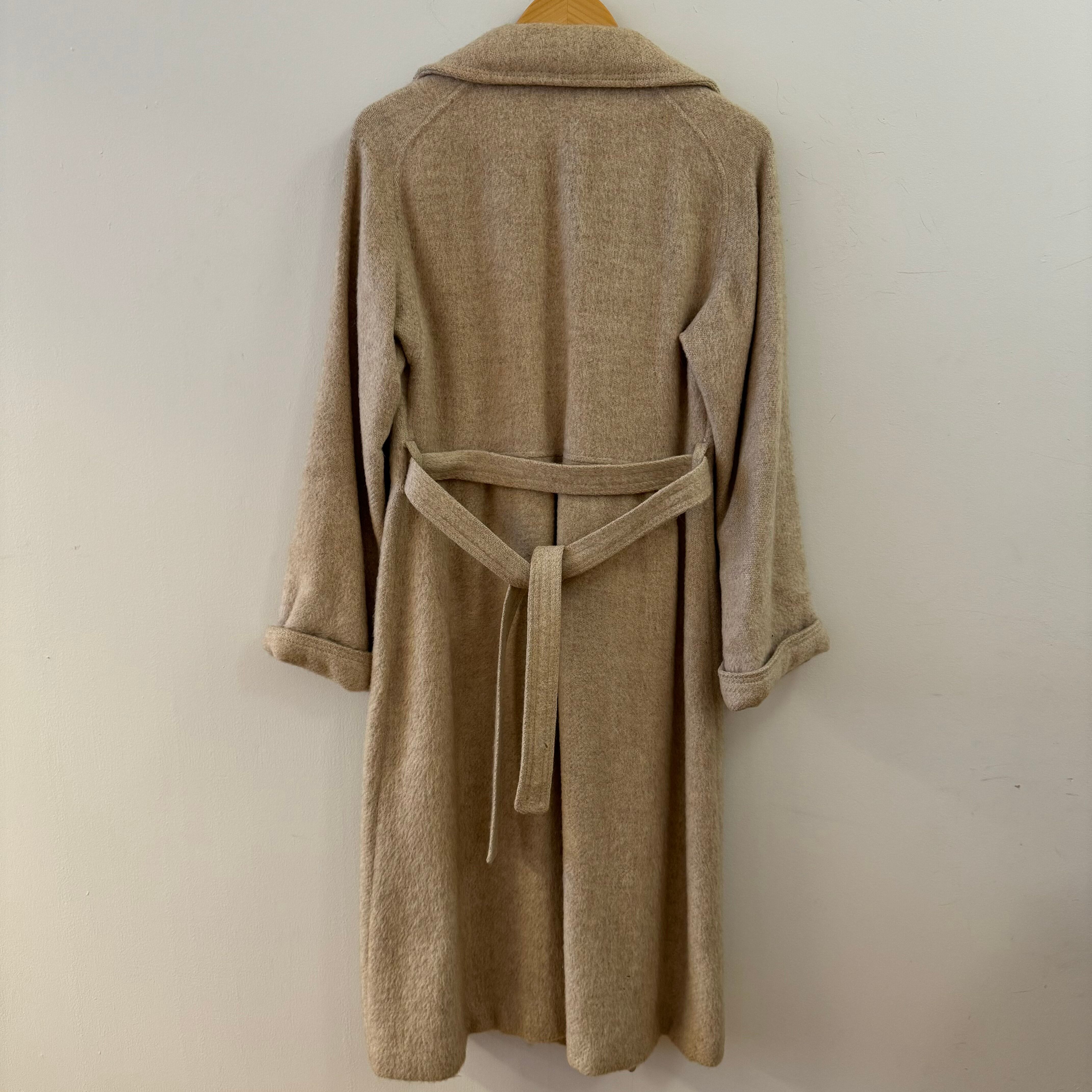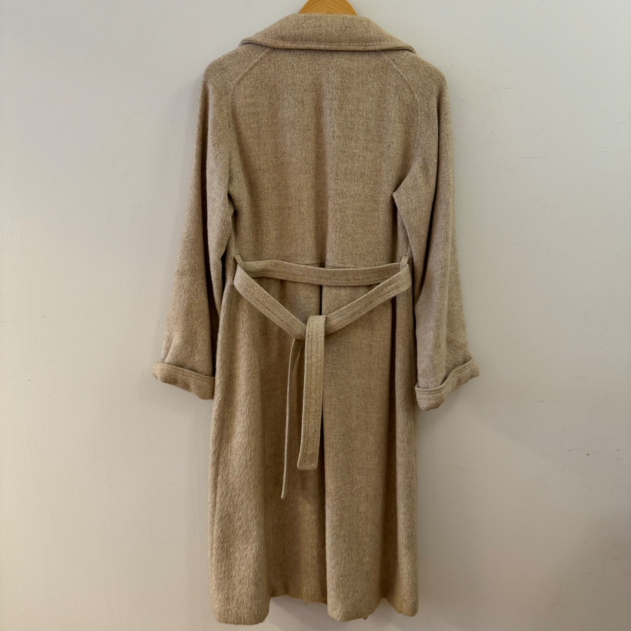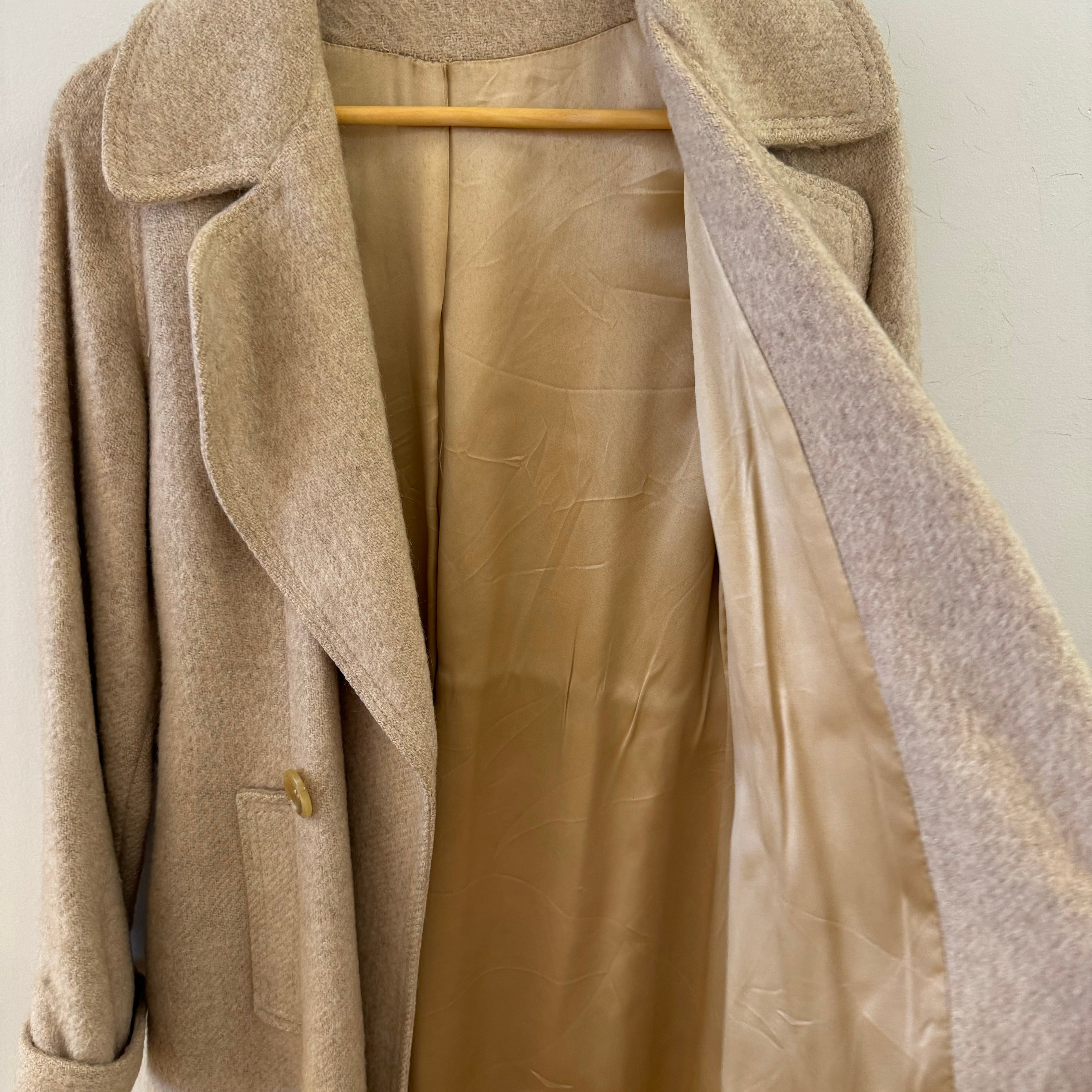 商品詳細 : 上質なウール素材を使用した、クラシックなベージュのロングコートです。