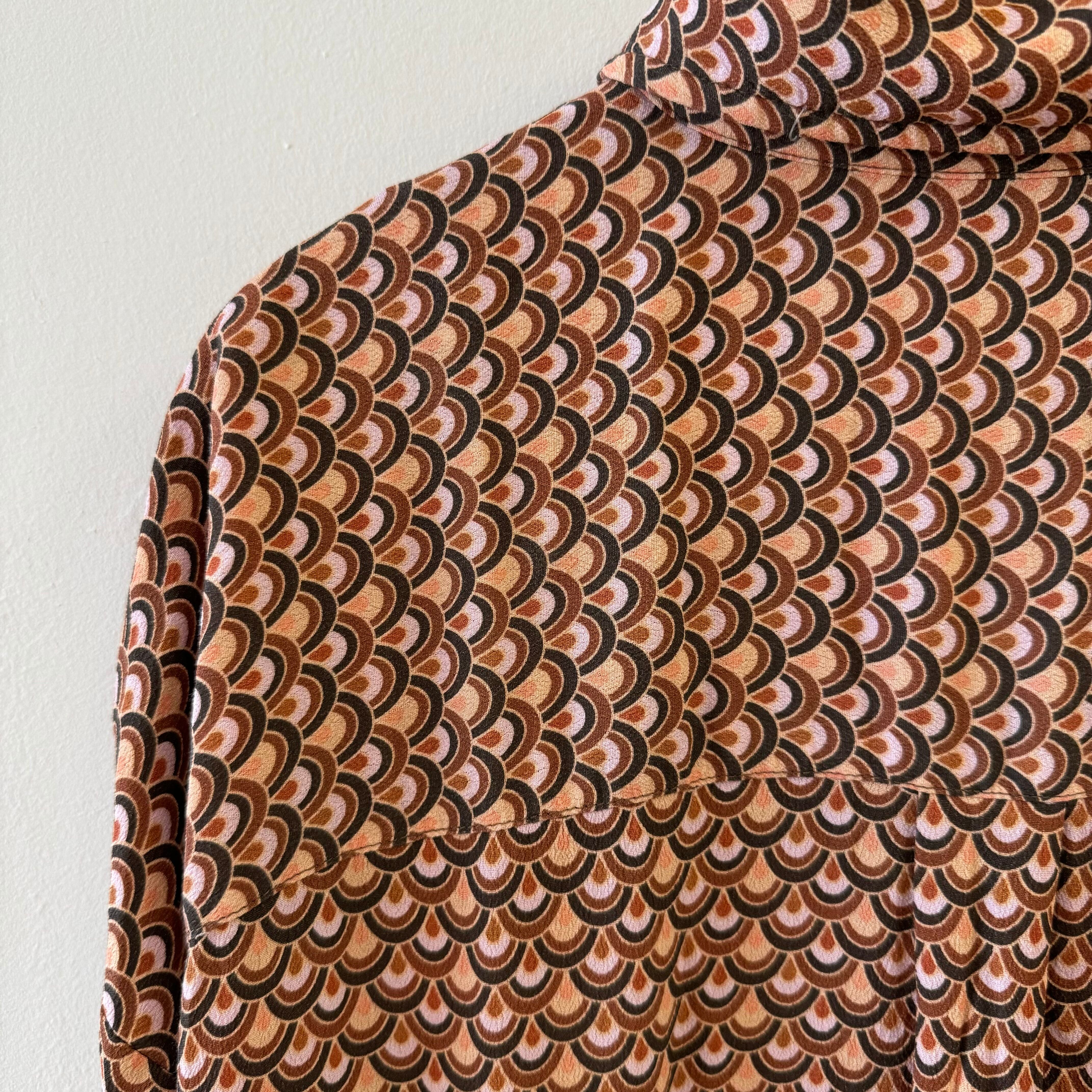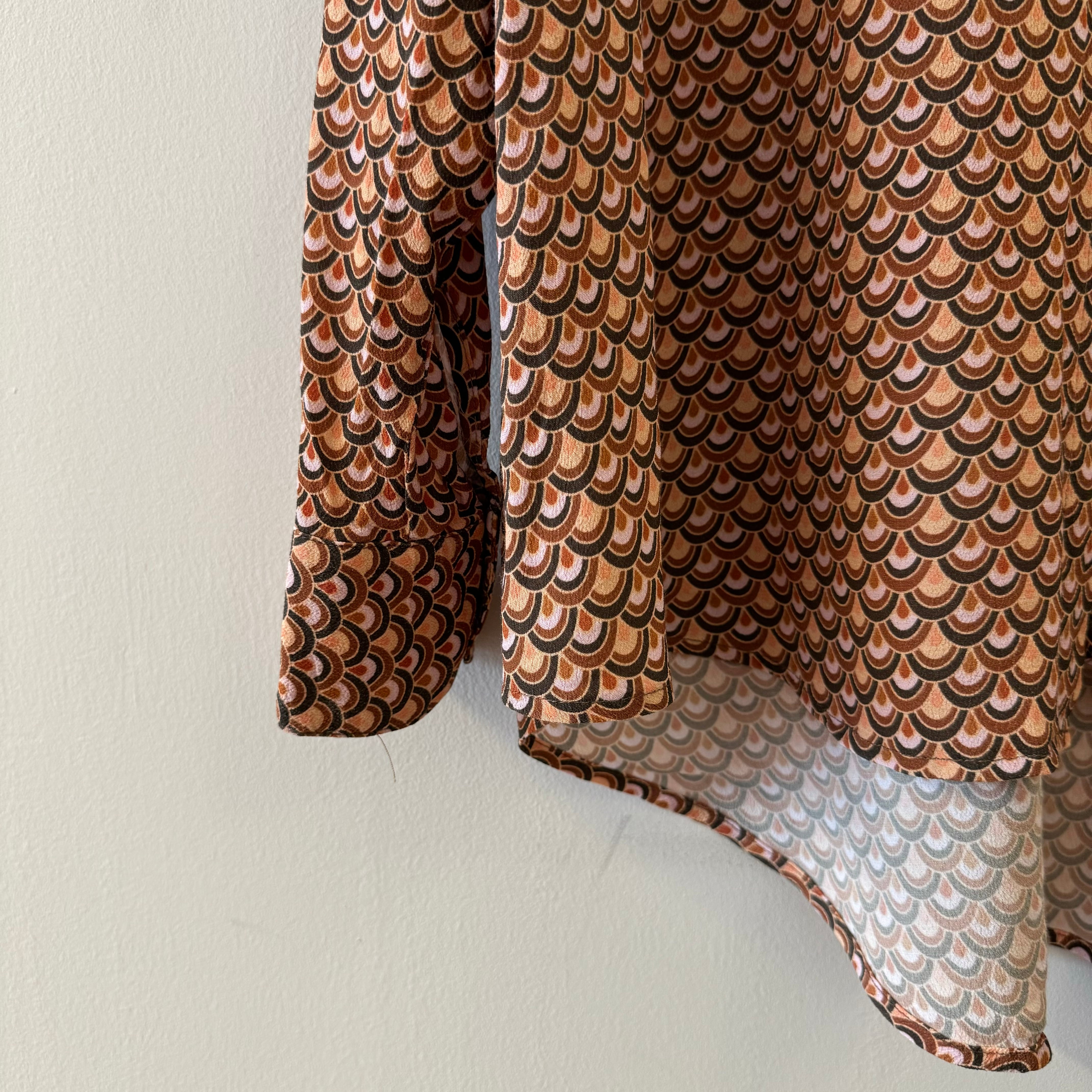 ブラウン・ピンク・ブラックのアーチ状パターンが全面に施された、70’s レトロな雰囲気漂う一枚です。