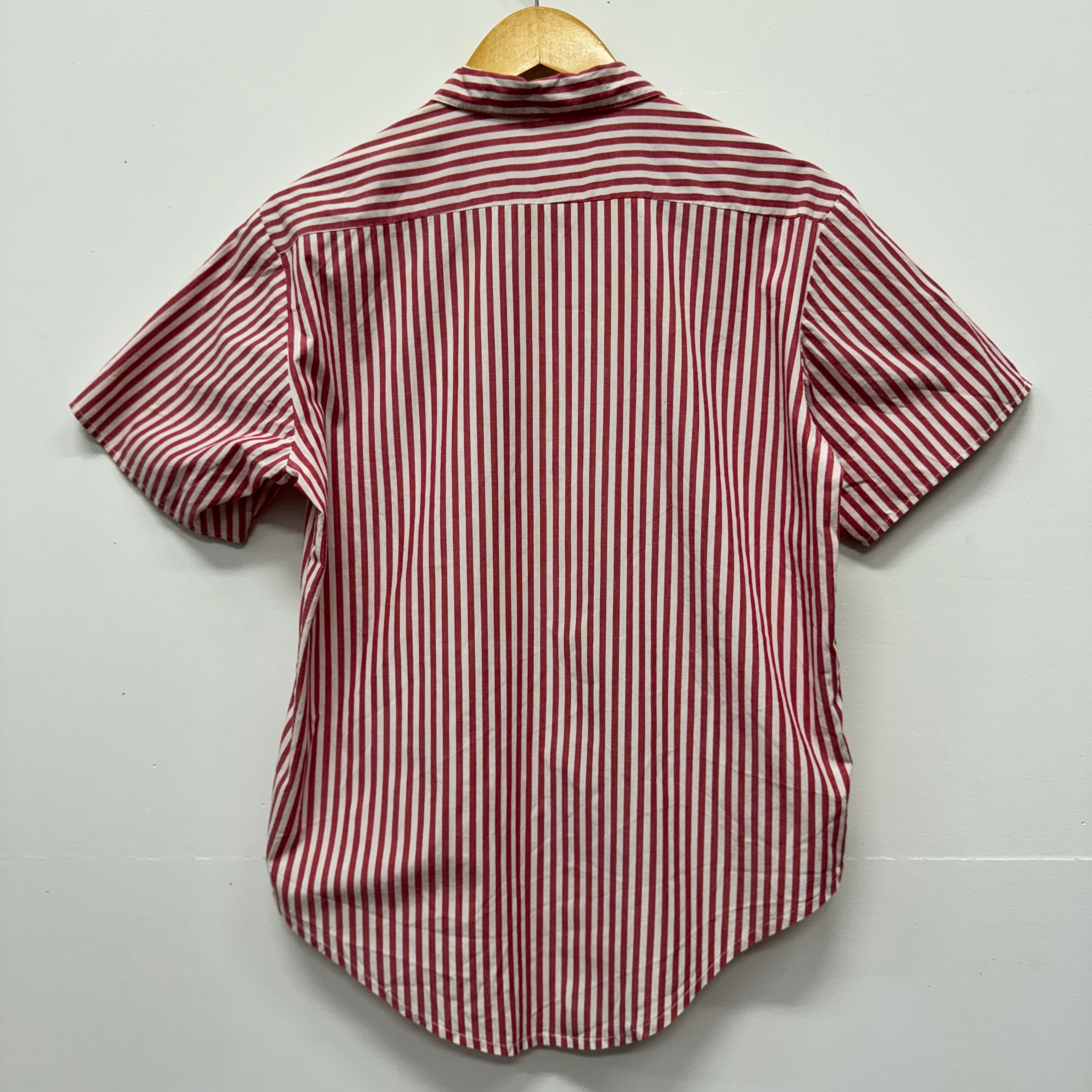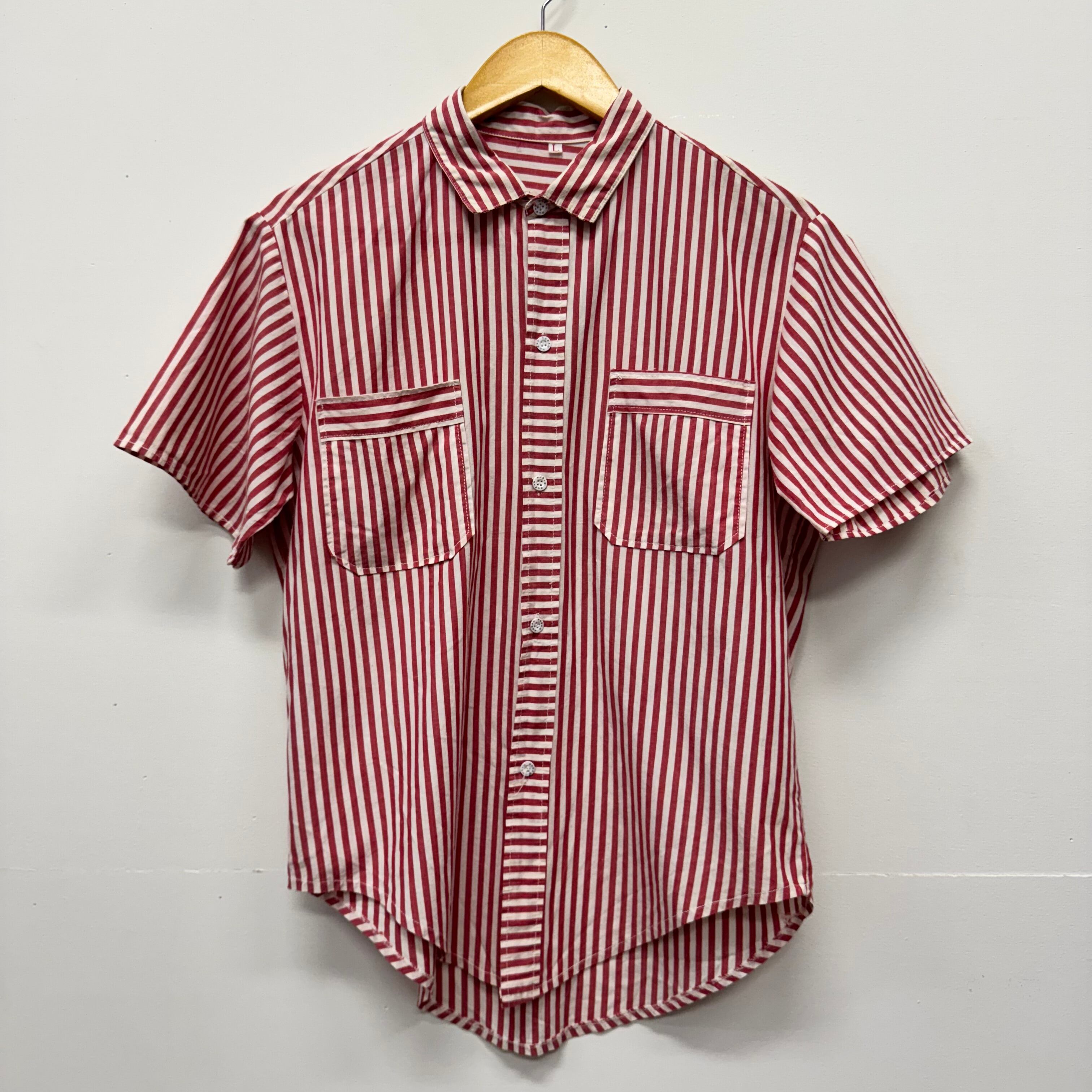 商品詳細 : レトロな雰囲気漂う赤×白のストライプ柄半袖シャツです。
